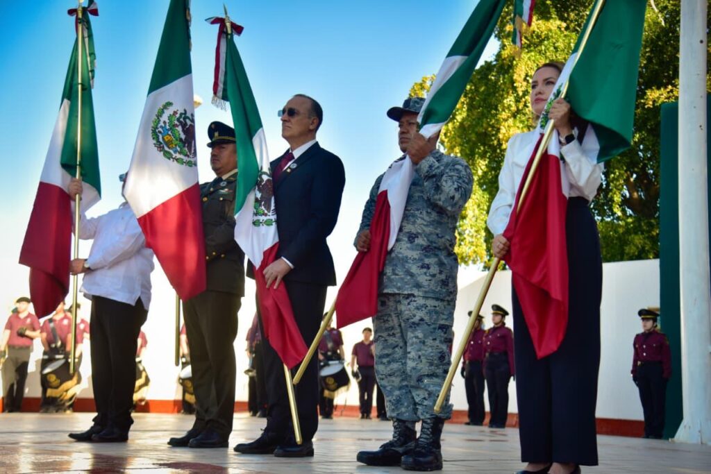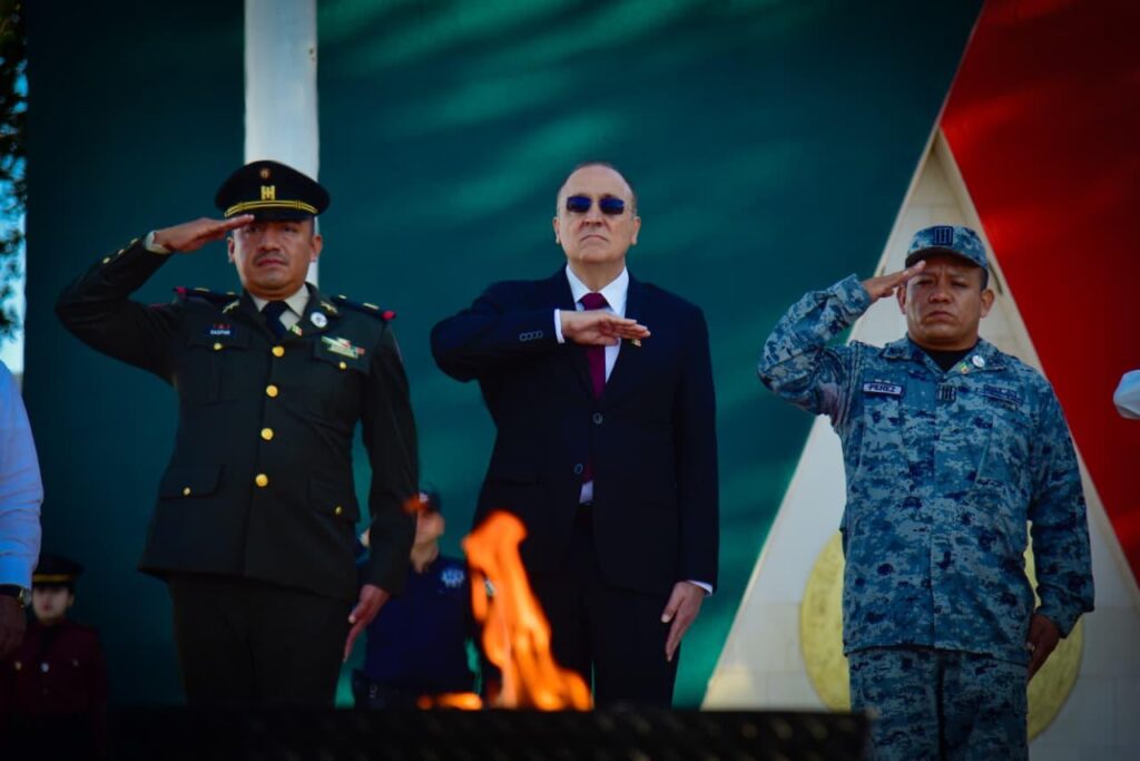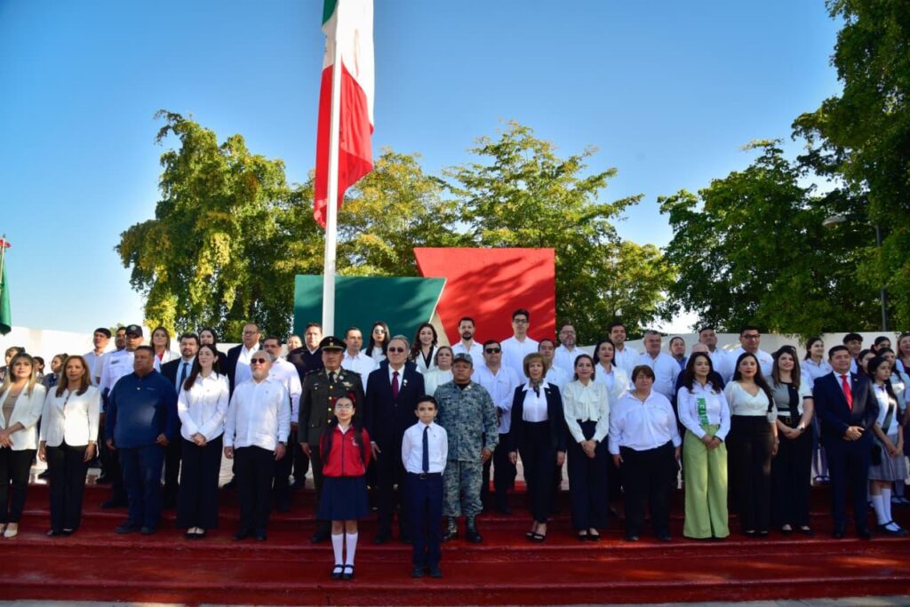 La ceremonia comenzó con el Izamiento de Bandera en la Explanada del Palacio Municipal, con autoridades, servidores públicos, estudiantes y ciudadanía.