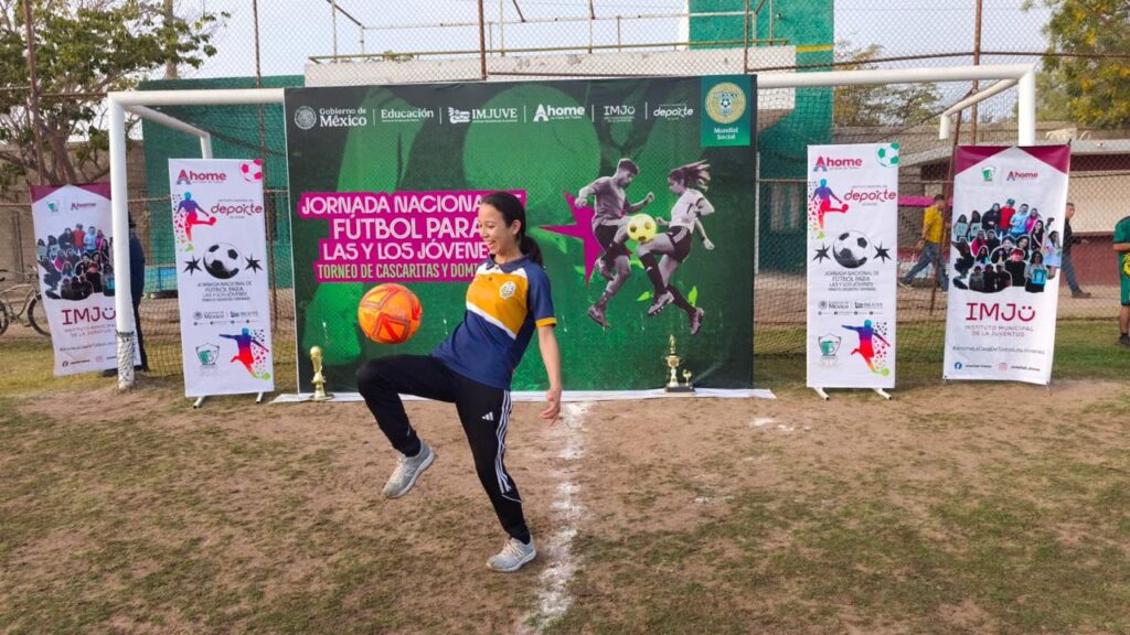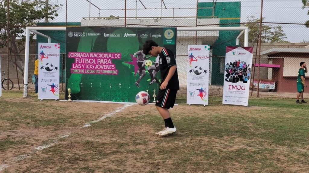 Los Mochis, Sinaloa. A 26 Marzo 2026.- El Ayuntamiento de Ahome participó en la Jornada Nacional de Fútbol para las y los Jóvenes “Torneo de Cascaritas y Dominadas”, iniciativa del Gobierno de México para promover el deporte y la sana convivencia.  La actividad, simultánea en las 32 entidades, se enlazó con La Mañanera del Pueblo de la Presidenta Claudia Sheinbaum Pardo.