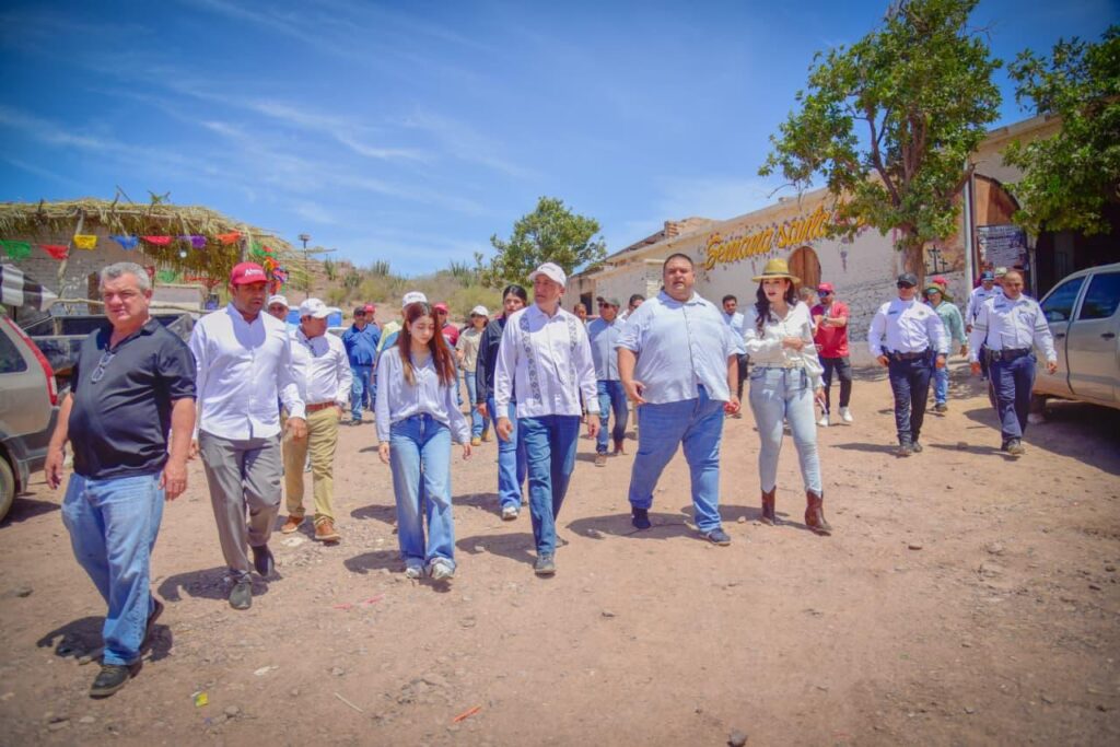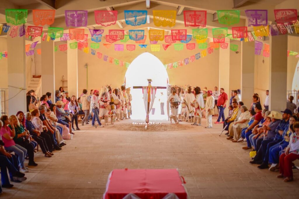 San Miguel Zapotitlán, Ahome, Sinaloa. A 03 de abril de 2026.- El Presidente Municipal de Ahome, Antonio Menéndez de Llano Bermúdez, visitó el centro ceremonial de San Miguel Zapotitlán durante Semana Santa para presenciar el sincretismo religioso y cultural de la región. Acompañado por su hija Carolina, el diputado Juan Diego Aranzubia Iturrios, la regidora Aurora Alcántar Castro, el síndico Marcos López Contreras y funcionarios municipales, observó los momentos litúrgicos y ceremoniales.